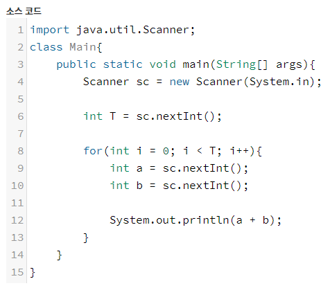 for(int i = 0; i < T; i++){ // 각 줄에는 A와 B가 주어진다.