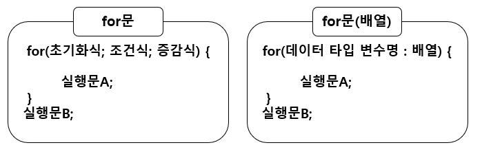 - for문의 수행 순서 : 1. 초기화식 -> (조건식 -> 실행문 A -> 증감식) -> 조건식[false] -> 실행문 B