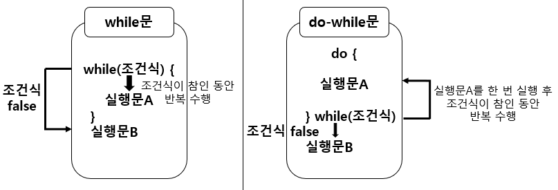 - do-while문은 while문과 동일한 방식을 따르지만 다른 점은 조건을 따지기 전 실행문을 1번 먼저 실행합니다.