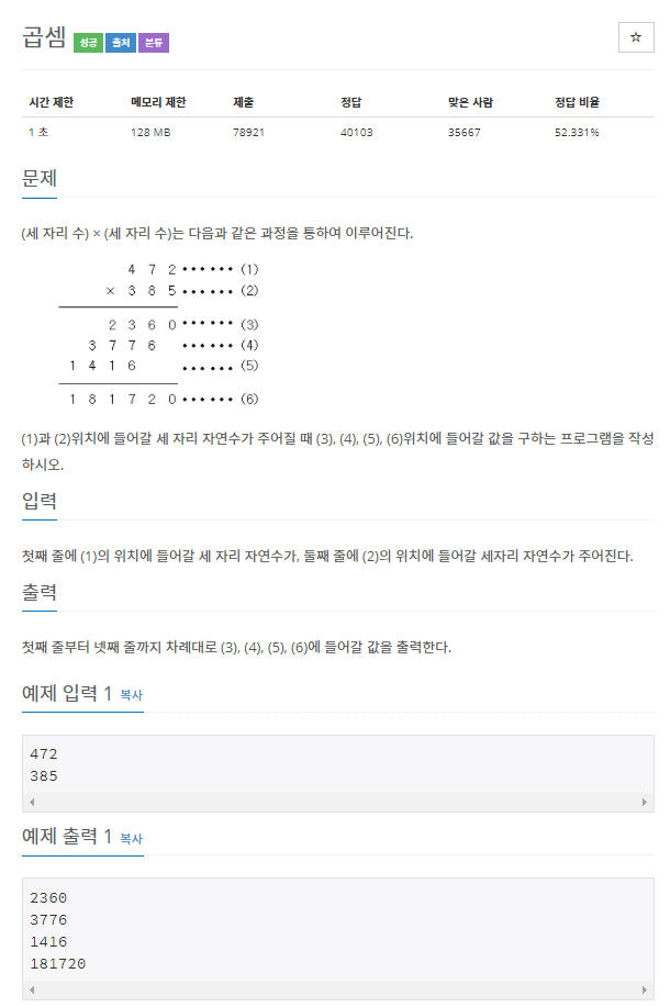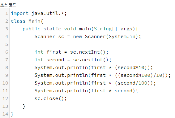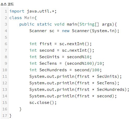 처음에는 각 자릿수를 6개의 변수로 만들어서 각각 곱하여 결과를 출력하는 방식을 짰습니다.